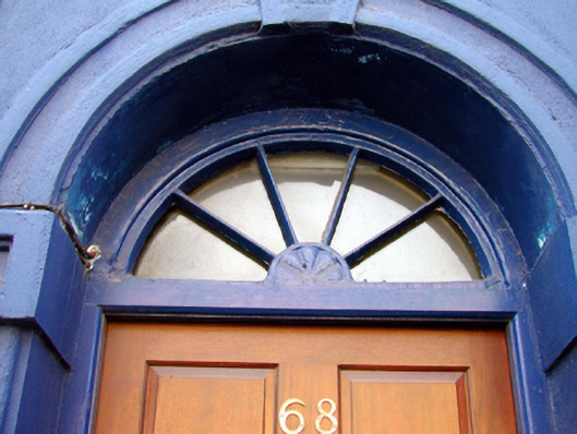 Terraced two-bay four-storey house, c.1840. Extensively renovated, c.1990, with openings remodelled to ground floor to accommodate use as apartments. One of a pair. Pitched slate roof with clay ridge tiles, rendered chimney stack, and replacement uPVC rainwater goods, c.1990, on moulded rendered eaves. Painted rendered, ruled and lined walls. Square-headed window openings (remodelled, c.1990, to ground floor) with cut-stone sills (replacement concrete sill, c.1990, to ground floor). Replacement 3/6 and 6/6 timber sash windows, c.1990, (in bipartite arrangement to ground floor). Round-headed door opening with moulded rendered surround having keystone, and replacement timber panelled door, c.1990, with spoked fanlight. Road fronted with concrete footpath to front.