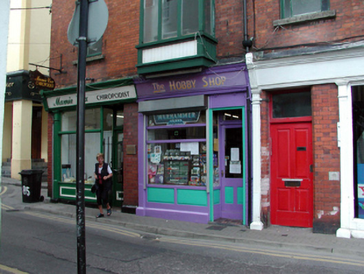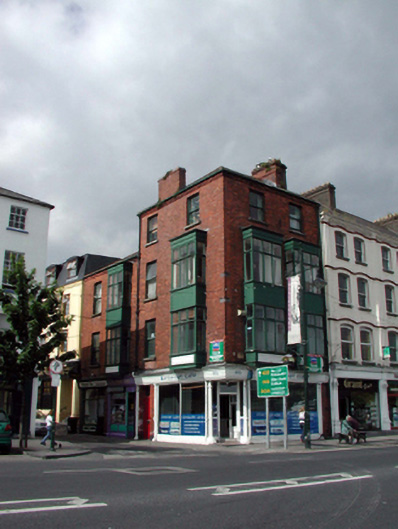 Terraced single-bay three-storey red brick building, built 1896, retaining original aspect with shopfront to ground floor, and single-bay two-storey box oriel window to upper floors. Pitched (shared) slate roof with clay ridge tiles, red brick chimney stack, and cast-iron rainwater goods on moulded red brick eaves. Red brick Flemish bond walls to upper floors with moulded red brick cornice to eaves. Square-headed window openings to box oriel windows with timber casement windows. Timber shopfront to ground floor with pilasters, fixed-pane timber display window, glazed timber panelled door, and timber fascia over with moulded cornice. Road fronted with concrete brick cobbled footpath to front.