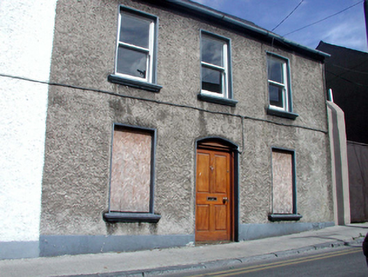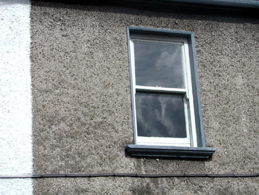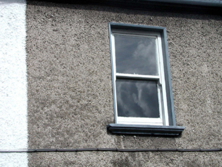 End-of-terrace three-bay two-storey house, built 1881, retaining original fenestration. Reroofed, c.1980. Now disused. One of a pair. Pitched (shared) roof with replacement artificial slate, c.1980, clay ridge tiles, rendered (shared) chimney stack, and cast-iron rainwater goods on rendered eaves. Unpainted roughcast walls. Square-headed window openings with stone sills, and 1/1 timber sash windows (now boarded–up to ground floor). Shallow segmental-headed door opening with replacement timber panelled door, c.1980. Road fronted with concrete footpath to front.