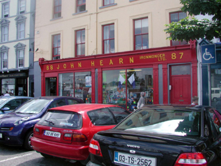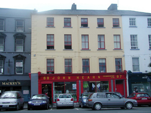 Terraced five-bay four-storey building, c.1830, originally two-separate two-bay four-storey (south-east) and three-bay four-storey (north-west) houses with single-bay four-storey side elevation to south-east. Extensively renovated and amalgamated, c.1880, with shopfronts inserted to ground floor. Hipped (shared) slate roof with clay ridge tiles, rendered chimney stacks, and cast-iron rainwater goods. Painted rendered walls with rendered quoins to corner. Square-headed window openings with stone sills, and moulded rendered surrounds to first floor. Replacement 2/2 timber sash windows, c.1880. Timber shopfronts, c.1880, to ground floor with panelled pilasters, fixed-pane timber display windows, timber panelled doors with clay-tiled approach, overlights, and timber fascia over having consoles and moulded cornice. Road fronted with concrete brick cobbled footpath to front.
