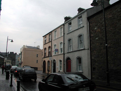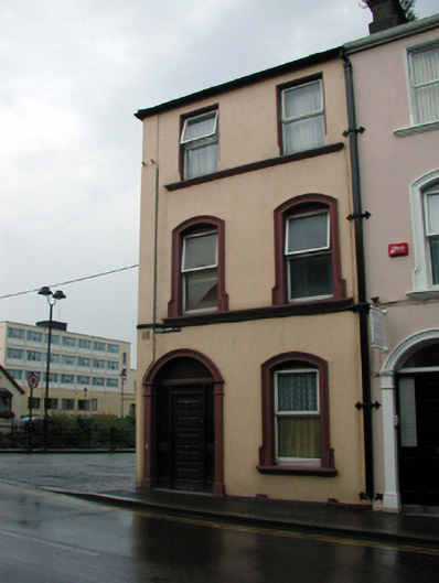 End-of-terrace two-bay three-storey house, c.1890, on a corner site. Extensively renovated, c.1990, to accommodate use as apartments. One of a terrace of three. Hipped (shared) slate roof with clay ridge tiles, rendered chimney stack, and cast-iron rainwater goods on rendered eaves having Fleur-de-Lys brackets to down pipes. Painted rendered walls. Shallow segmental-headed window openings to ground and to first floor with square-headed window openings to top floor, moulded rendered sills and sill courses, moulded rendered surrounds, and moulded reveals to top floor. Replacement uPVC casement windows, c.1990. Segmental-headed door opening with moulded rendered surround, replacement timber panelled door, c.1980, sidelights and overlight. Road fronted on a corner site with concrete brick cobbled footpath to front.