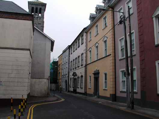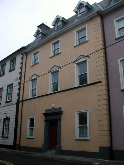 Terraced three-bay three-storey house with dormer attic, c.1750, with three-bay three-storey canted bowed bay to rear (south) elevation. Extensively renovated, 1998, with dormer attic added to accommodate use as apartments. Pitched roof (gabled to dormer attic windows) with replacement artificial slate, 1998, clay ridge tiles, replacement square rooflights, 1998, and replacement uPVC rainwater goods, 1998, on replacement overhanging uPVC eaves, 1998. Painted replacement rendered walls, 1998, with rendered quoined piers, and moulded rendered course to first floor. Square-headed window openings with moulded rendered sills (forming sill course to first floor), and moulded rendered surrounds having pediments to first floor. Replacement 1/1 timber sash windows, 1998. Square-headed door opening with three cut-limestone steps, rendered pilaster doorcase with triglyph frieze, moulded entablature, blocking course over, and replacement glazed timber panelled door, 1998. Road fronted with concrete footpath to front.