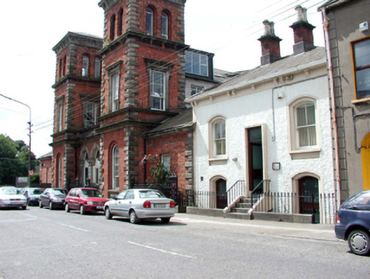 Attached three-bay single-storey double-pile over raised basement house, built 1859-61, on square plan. In alternative use, 1871-1911. Now in alternative use. Hipped double-pile (M-profile) slate roof with clay or terracotta ridge tiles, paired red brick Rattrap bond central chimney stacks on limestone ashlar chamfered plinths having ogee-detailed cornices below capping supporting yellow terracotta tapered pots, and replacement uPVC rainwater goods on rendered eaves on paired ogee-detailed consoles retaining cast-iron downpipes. Replacement roughcast walls with rendered strips to ends supporting rendered band to eaves; red brick surface finish (side elevations) with rendered surface finish to rear (west) elevation. Remodelled square-headed central door opening approached by flight of four cut-limestone steps with rendered monolithic surround framing glazed timber panelled door having overlight. Camber-headed flanking window openings in camber-headed recesses with cut-limestone sills on recessed risers, and rendered surrounds framing two-over-two timber sash windows. Interior including (ground floor): central hall with flight of eight steps; square-headed door opening into inner hall with glazed timber panelled door. Street fronted with "Fleur-de-Lys"-detailed mild steel railings to perimeter.