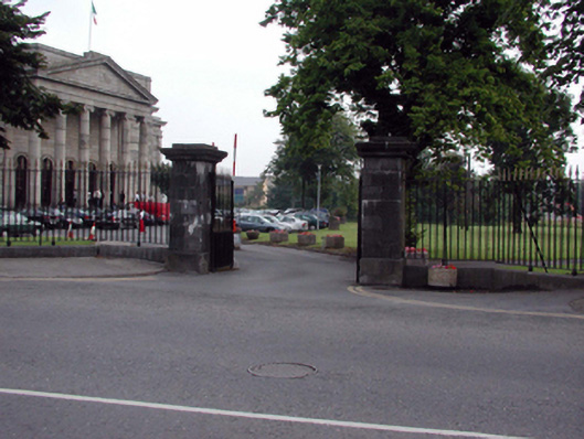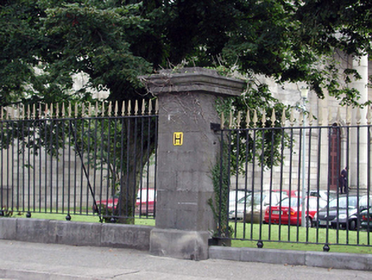 Gateway, extant 1871, on a symmetrical plan comprising pair of drag edged limestone ashlar piers on cut-limestone chamfered plinths having ogee-detailed cornices below capping supporting spear head-detailed cast-iron double gates with drag edged limestone ashlar outer piers on cut-limestone chamfered plinths having ogee-detailed cornices below capping supporting spear head-detailed cast-iron railings. Street fronted at entrance to grounds of Waterford Courthouse.