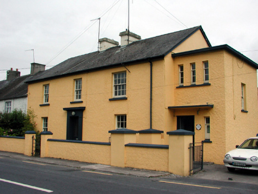 End-of-terrace three-bay two-storey Garda Síochána Station, built 1926, retaining original fenestration and probably incorporating fabric of earlier constabulary barrack, c.1875, on site. Extended, c.1950, comprising single-bay two-storey flat-roofed recessed lower end bay to east. Pitched artificial slate roof with clay ridge tiles, rendered chimney stacks and cast-iron rainwater goods on timber eaves. Flat felt roof to end bay with timber eaves. Painted roughcast walls to front (south) elevation with painted rendered walls to remainder. Square-headed window openings (one round-headed opening to rear (north) elevation) with stone sills. 6/6 and 8/8 timber sash windows. Grouped (three) square-headed window openings to end bay with shared concrete sill and 1/2 timber sash window. Square-headed door opening with rendered surround having entablature over and replacement glazed timber door, c.1975. Square-headed door opening to end bay under concrete canopy with replacement glazed timber door, c.1975. Set back from line of road with forecourt to front having painted roughcast boundary wall with painted roughcast piers having wrought iron gate and painted rendered piers with hoop iron gate. (ii) Attached two-bay single-storey mono-pitched outbuilding, c.1950, to north. Refenestrated, c.1975. Mono-pitched roof (materials not visible) with clay ridge tiles and cast-iron rainwater goods. Painted roughcast walls. Square-headed window opening with replacement timber casement window, c.1975. Square-headed door opening with timber double doors.