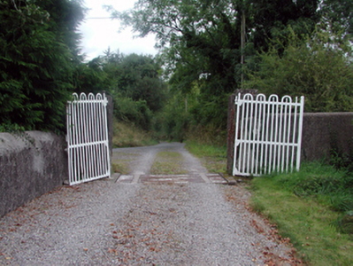 Gateway, c.1880, comprising unpainted roughcast piers with wrought iron double gates having twisted finials with hoop detailing over, and sections of unpainted roughcast flanking boundary walls. Road fronted at entrance to grounds to Nirevale.