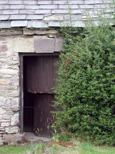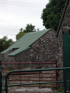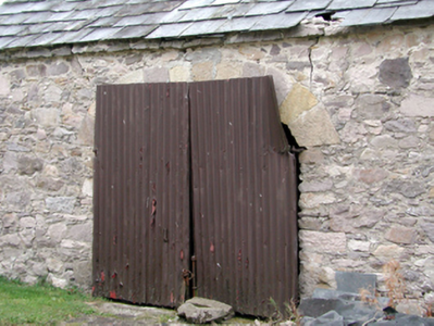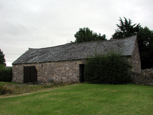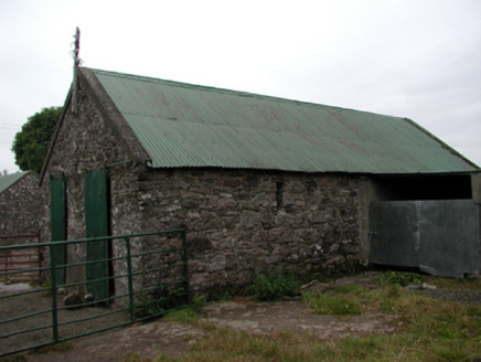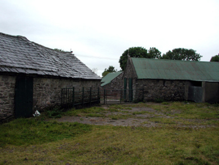 Farmyard complex, c.1850, comprising: (i) Detached two-bay single-storey rubble stone outbuilding with elliptical-headed carriageway to left. Pitched slate roof with clay ridge tiles and squared rubble stone course to eaves. Random rubble stone walls with lime mortar. Square-headed door opening with squared rubble stone voussoirs and timber boarded half-door. Elliptical-headed carriageway with squared rubble stone voussoirs and replacement corrugated-iron double doors, c.1950. Set back from road in shared grounds. (ii) Detached two-bay single-storey rubble stone outbuilding to north with square-headed carriageway to right. Reroofed and renovated, c.1950, with carriageway remodelled. Pitched roof with painted replacement corrugated-iron, c.1950, iron ridge tiles, rendered coping and squared rubble stone course to eaves. Random rubble stone walls with lime mortar. Square-headed slit-style window openings with no fittings. Square-headed carriageway remodelled, c.1950, to right with replacement concrete reveals, c.1950, and no fittings. Pair of square-headed door openings to side (south) elevation with replacement painted corrugated-iron rolling doors, c.1950. (iii) Detached three-bay single-storey rubble stone outbuilding to north-west. Reroofed and extended, c.1950, comprising pair of single-bay single-storey lean-to lower returns to south. Pitched roof (continuing into lean-to roofs to returns) with replacement painted corrugated-iron, c.1950, iron ridge tiles, rendered coping and squared rubble stone course to eaves. Random rubble stone walls with lime mortar. Exposed concrete block construction to returns. Openings not visible.