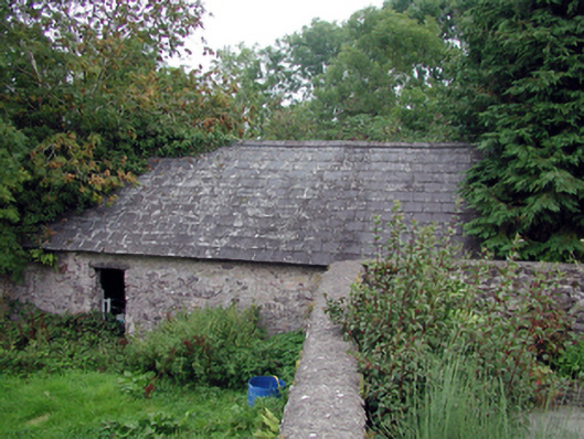 Detached two-bay single-storey rubble stone outbuilding, c.1850. Now disused. Pitched slate roof with clay ridge tiles and no rainwater goods on lime rendered squared rubble stone eaves. Random rubble stone walls with lime mortar and remains of unpainted roughcast lime render over. Square-headed door opening with stone lintel and fitting now gone. Set back from road in shared grounds.