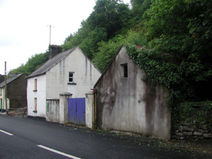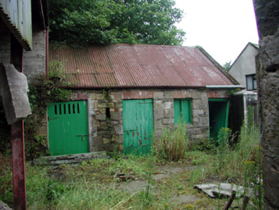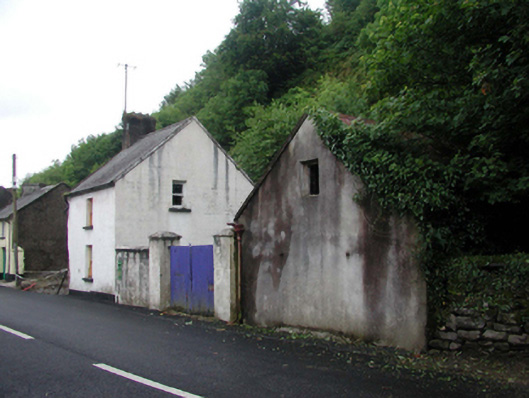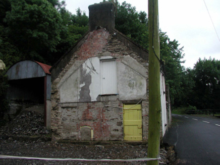 Detached single-bay two-storey house, c.1860, originally attached retaining original aspect. Now disused. Pitched slate roof with clay ridge tiles, rendered chimney stack, rendered coping, and cast-iron rainwater goods on rendered eaves. Painted rendered, ruled and lined walls. Exposed random rubble stone construction to side (north-east) and rear (south-east) elevations with red brick sections. Square-headed window openings with stone sills, and 1/1 timber sash windows. Square-headed door openings to side (north-east) elevation (originally internal doors) with timber boarded door to ground floor, and tongue-and-groove timber panelled door to first floor. Road fronted with enclosed grounds to site. (ii) Detached four-bay single-storey outbuilding with attic, c.1860, to south-west. Reroofed, c.1935. Now disused. Pitched roof with replacement corrugated-iron, c.1935, iron ridge tiles, rendered coping, and cast-iron rainwater goods. Exposed random squared rubble stone wall to front (north-east) elevation. Unpainted replacement rendered walls, c.1935, to remainder. Square-headed window opening with no sill, red brick ‘voussoirs’, and timber boarded fitting. Square-headed door openings with red brick ‘voussoirs’, and timber boarded doors. (iii) Gateway, c.1860, comprising pair of rendered piers with rendered capping, timber boarded double gates, and section of painted rendered, ruled and lined boundary wall to north-east.