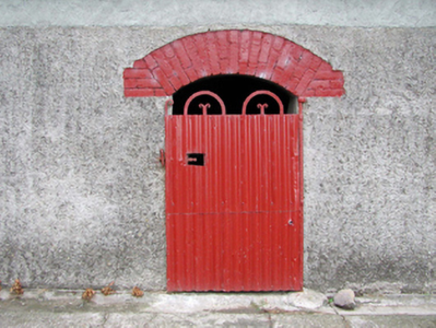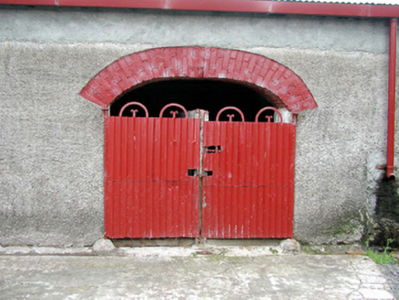 Detached three-bay single-storey mono-pitched outbuilding, c.1875, with series of three segmental-headed carriageways. Extensively renovated, c.2000. Mono-pitched roof with replacement corrugated-ion, c.2000, and replacement metal rainwater goods, c.2000. Unpainted roughcast wall to front (south-west) elevation raised, c.2000, with unpainted replacement cement render, c.2000, to remainder. Square-headed slit-style window openings. Fittings not discerned. Series of three segmental-headed carriageways with painted red brick ‘voussoirs’, and corrugated-iron doors and double doors having hoop detailing. Set back from line of road at angle to road with concrete verge to front.