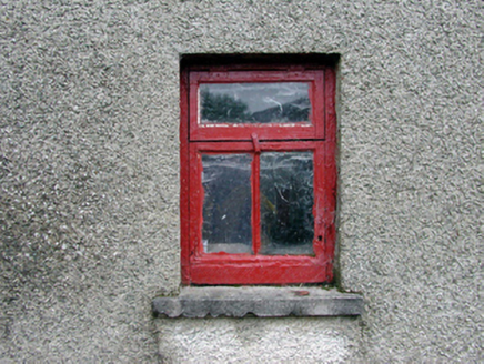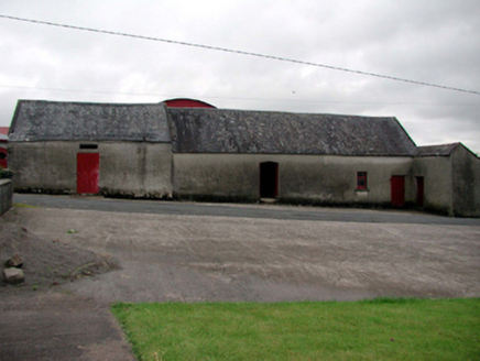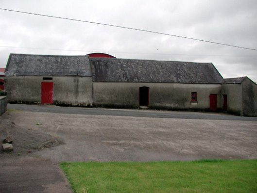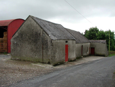 Detached four-bay single-storey outbuilding with attic, c.1875, retaining early aspect comprising three-bay single-storey range with attic with single-bay single-storey higher advanced end bay to north, and single-bay single-storey lean-to projecting end bay to south having two-bay single-storey side elevation to south. Pitched and lean-to slate roofs with clay ridge tiles, rendered coping, and no rainwater goods on slate eaves. Unpainted roughcast walls. Square-headed window openings with stone sills, and timber casement windows. Square- and shallow segmental-headed door openings with timber boarded doors. Road fronted.