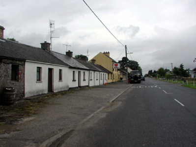 Terraced three-bay single-storey house, c.1860. Extensively renovated, c.1985. Now disused. One of a terrace of six. Pitched (shared) roof with replacement artificial slate, c.1985, clay ridge tiles, replacement yellow brick chimney stack, c.1985, and no rainwater goods on rendered eaves. Painted rendered walls. Square-headed window openings with stone sills, and replacement timber casement windows, c.1985. Square-headed door opening with replacement timber panelled door, c.1985. Set back from line of road with gravel verge to front.