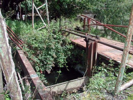 Pair of waterwheel pits, built 1825, retaining fragments of original machinery. Waterwheels now missing. Coursed squared limestone retaining walls leading to Clodiagh Canal to south/south-east having axle mounting blocks (originally supporting waterwheels), and remains of sluice gates to north. Sited on canalised section of Clodiagh River (forming Clodiagh Canal) in grounds shared with Portlaw Cotton Factory.
