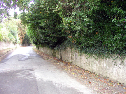 Section of random rubble stone wall, c.1830, on a shallow concave plan incorporating circular opening with sections of random rubble stone flanking walls having pair of rubble stone piers to south-east possibly originally flanking gateway opening. Road fronted.