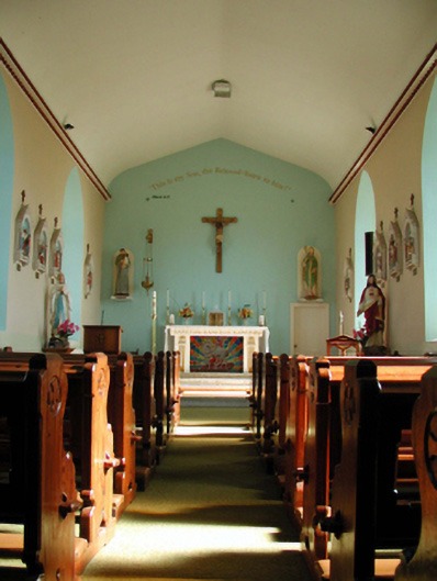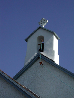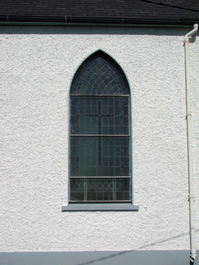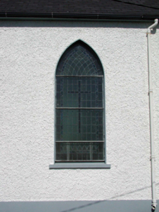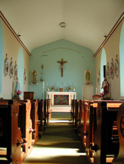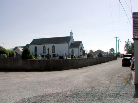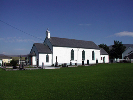 Detached three-bay double-height single-cell Catholic church, c.1850, with single-bay double-height gabled projecting lower entrance bay to west. Reroofed and extended, 1986, comprising single-bay single-storey sacristy to east with single-bay single-storey advanced porch added to west. Pitched roofs (hipped to porch) with replacement artificial slate, 1986, clay ridge tiles, rendered gabled bellcote to apex to west (with rendered coping and cross finial), and cast-iron rainwater goods on rendered eaves. Painted roughcast walls with rendered strips to corners. Pointed-arch window openings to nave and to entrance bay with rendered sills. Fixed-pane leaded stained glass windows. Square-headed window openings to sacristy with concrete sills, and timber casement windows. Square-headed door opening to porch behind pair of cast-concrete columns with timber panelled double doors. Square-headed door opening to sacristy with timber panelled door. Full-height interior with carved timber pews, carved stations, timber panelled gallery to first floor to west, decorative altar furniture, and ogee-profiled ceiling on moulded plasterwork cornice. Set back from road in own grounds with painted rendered panelled piers having rendered pyramidal capping, wrought iron double gates, and sections of wrought iron flanking railings on painted rendered plinth. (ii) Graveyard to site with various cut-stone grave markers, c.1850 – c.1950.