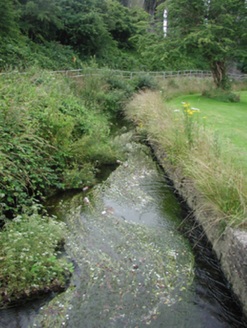 Rubble stone weir, c.1800. Renovated, c.1950, with cast-concrete sections. Sited spanning River Mahon with grass banks to river.