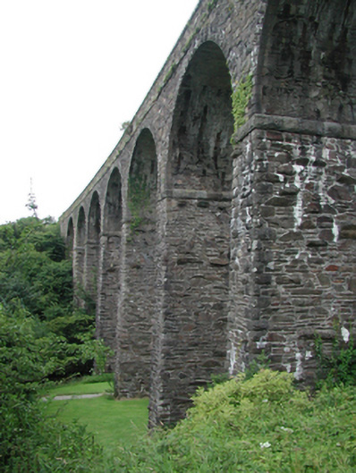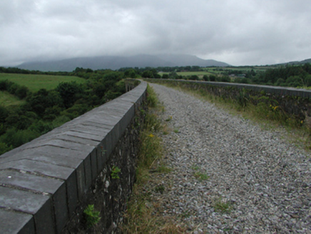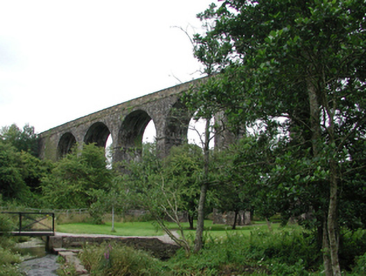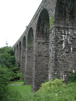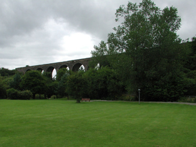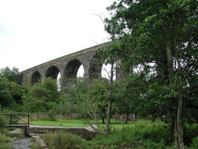 Eight-arch rubble stone railway viaduct over road, mill race and river, opened 1878, on a shallow curved plan. Closed, 1982. Random rubble stone walls with cut-stone stringcourse, and cut-stone coping to parapets. Series of eight round arches on random rubble stone tapered piers with cut-stone stringcourses to springs of arches, dressed rubble stone voussoirs, and squared rubble stone soffits. Sited spanning road, mill race and River Mahon with grass banks to north-west and to south-east.