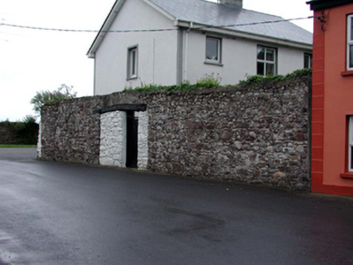 Section of random rubble stone boundary wall, c.1800, on an L-shaped plan with remains of shallow segmental-headed carriageway to north-east. Renovated, c.1950, with carriageway blocked-up forming square-headed gateway. Random rubble stone walls with batter, and slate coping to south-east. Square-headed door opening in remains of shallow segmental-headed carriageway having timber lintel. Road fronted on a corner site.