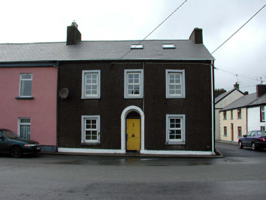 End-of-terrace three-bay two-storey house with dormer attic, c.1825, on a corner site. Extended, c.1950, comprising single-bay two-storey lean-to lower return to north-west. Extensively renovated, c.2000. One of a pair. Pitched (shared) roof (lean-to to return) with replacement artificial slate, c.2000, concrete ridge tiles, rendered chimney stacks, replacement square rooflights, c.2000, and replacement uPVC rainwater goods, c.2000, on rendered eaves. Unpainted roughcast walls to front (south-east) elevation with unpainted rendered walls to remainder having rendered channelled piers to rear (north-west) elevation with tooled detailing. Square-headed window openings with stone sills, and rendered surrounds. Replacement uPVC casement windows, c.2000, with one early 2/2 timber sash window to side (north-east) elevation. Round-headed door opening with rendered surround, timber panelled door, and overlight. Road fronted on a corner site with concrete footpath to front.