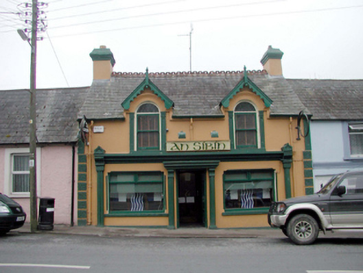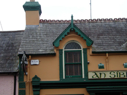 Terraced three-bay single-storey house with half-dormer attic, c.1880, with pubfront to ground floor. Part refenestrated, c.1980. Pitched slate roof (gabled to half-dormer attic windows) with decorative red clay ridge tiles, rendered chimney stacks with moulded capping, scalloped timber bargeboards, and cast-iron rainwater goods on rendered eaves. Painted rendered walls. Square-headed window openings to ground floor with replacement concrete sills, c.1980, and chamfered reveals. Replacement timber casement display windows, c.1980. Round-headed window openings to half-dormer attic with panelled pilaster surrounds having moulded archivolts over. 1/1 timber sash windows with diamond-leaded fanlights. Square-headed door opening with timber panelled double doors. Rendered pubfront with fluted pilasters, dentilated entablature to door opening, moulded consoles, and dentilated moulded cornice. Road fronted with concrete footpath to front.