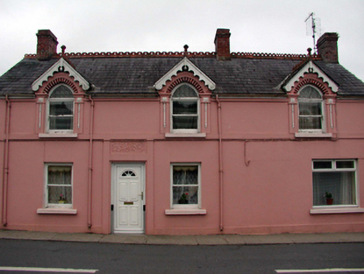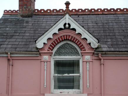 Detached four-bay single-storey house with half-dormer attic, c.1860, possibly originally two separate terraced three-bay single-storey (north) and single-bay single-storey (south) houses retaining some early fenestration. Renovated, c.1960, with window opening remodelled to right ground floor to accommodate commercial use. Extended, c.1985, comprising three-bay single-storey lean-to return to south-east. Now entirely in residential use. Pitched slate roof (gabled to half-dormer attic windows) with decorative red clay ridge tiles, red brick Running bond chimney stacks, decorative timber bargeboards to gables having terracotta finials to apexes, and cast-iron rainwater goods on rendered eaves. Lean-to artificial slate roof to return with plastic rainwater goods on timber eaves. Painted rendered walls with rendered stringcourse to first floor, and rendered band to eaves. Square-headed window openings to ground floor (remodelled, c.1960, to right ground floor) with rendered sills. Pointed-arch window openings to half-dormer attic with rendered sills, rendered pilaster surrounds, and rendered archivolts over having red brick voussoirs. 1/1 timber sash windows (replacement timber casement window, c.1985, to remodelled opening). Square-headed window openings to return with concrete sills, and timber casement windows. Square-headed door opening with rendered surround, roughcast panel over, and replacement glazed uPVC panelled door, c.2000. Road fronted with concrete footpath to front.