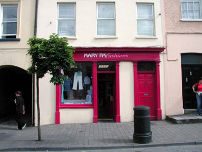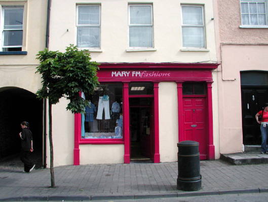 Terraced three-bay two-storey house with dormer attic, c.1870, with shopfront to ground floor. Part refenestrated, c.1970. Renovated and refenestrated, c.1995. Pitched slate roof (gabled to dormer attic windows) with clay ridge tiles, rendered (shared) chimney stacks, timber bargeboards, and cast-iron rainwater goods on rendered eaves having iron brackets. Painted rendered walls. Square-headed window openings with stone sills. Replacement uPVC casement windows, c.1995, with replacement timber casement windows, c.1970, to dormer attic. Timber shopfront to ground floor with pilasters, fixed-pane timber display window, timber panelled and glazed timber panelled doors with overlights, and timber fascia over having moulded cornice. Road fronted with concrete brick cobbled footpath to front.