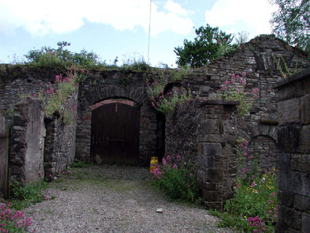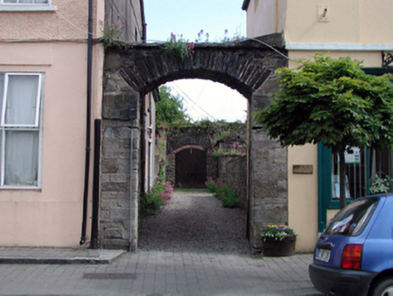 Terraced single-bay two-storey gable-fronted house with half-dormer attic, c.1790, with six-bay single-storey return to south-east, and originally with pair of segmental-headed flanking carriageways. Renovated and extended, c.1890, comprising single-bay two-storey end bay to south-west incorporating carriageway. Extensively renovated, c.1990, with shopfront inserted to ground floor to accommodate use. Pitched (gable-fronted) roof to main block with replacement artificial slate, c.1990, clay ridge tiles, rendered chimney stacks, rendered coping, and replacement uPVC rainwater goods, c.1990, on rendered eaves. Pitched roof to return with replacement profiled clay tile, c.1990, clay ridge tiles, and replacement uPVC rainwater goods, c.1990, on timber eaves. Pitched slate roof to end bay with clay ridge tiles, and cast-iron rainwater goods on rendered eaves with iron brackets. Painted rendered walls with rendered band to first floor, rendered piers to first floor, and rendered surround to gable forming open-bed pediment. Square-headed window opening to first floor and shallow segmental-headed window opening to half-dormer attic, all in tripartite arrangement and in shallow segmental-headed recess, with rendered sills. Replacement 2/2 timber sash windows, c.1990, with 1/1 sidelights. Square-headed window openings to remainder with concrete sills, and replacement uPVC casement windows, c.1990. Timber shopfront, c.1990, to ground floor with pilasters, fixed-pane timber display windows, timber panelled door with overlight, and timber fascia over having moulded cornice. Square-headed openings to end bay with timber doorcase having consoles, replacement timber panelled door, c.1990, overlight, and replacement uPVC casement flanking window, c.1990. Road fronted with concrete brick cobbled footpath to front. (ii) Gateway, c.1790, to north-east comprising shallow segmental-headed opening with squared rubble stone piers, rubble stone voussoirs, and cut-stone coping to parapet. Laneway to south-west with remains of stone cobbling (iii) Remains of detached single-bay single-storey rubble stone outbuilding with attic, c.1790, to south-west. Now in ruins. Pitched roof now gone. Random rubble stone walls. Outline of square-headed window opening now blocked-up with random rubble stone.