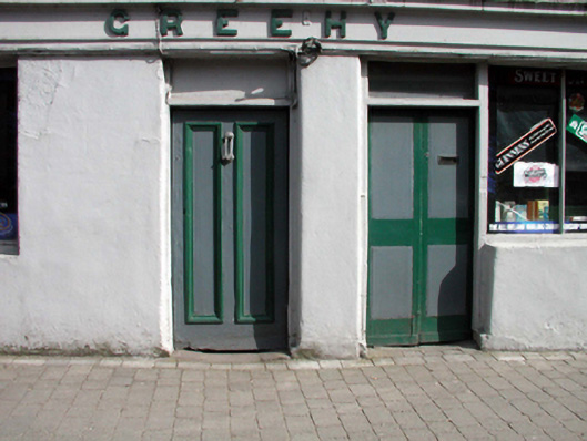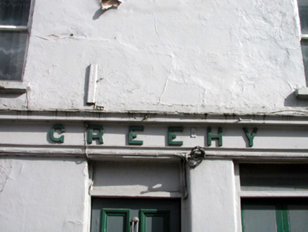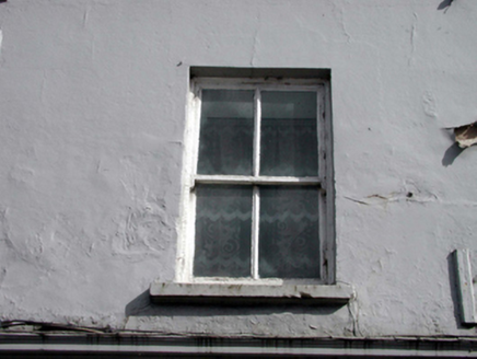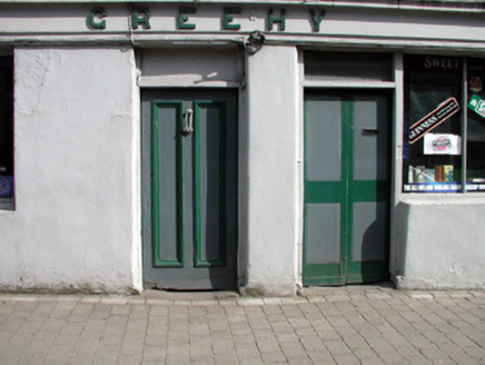 Terraced two-bay two-storey house with dormer attic, c.1790, possibly originally two separate single-bay two-storey houses. Extensively renovated, c.1865, with openings remodelled to ground floor to accommodate commercial use. Now disused to ground floor. Pitched slate roof with clay ridge tiles, rendered chimney stacks, square rooflight, and cast-iron rainwater goods on rendered eaves. Painted rendered walls with rendered quoins. Square-headed window openings with stone sills, and replacement 2/2 timber sash windows, c.1865. Square-headed openings remodelled, c.1865, to ground floor with fixed-pane timber display windows, timber panelled doors with overlights, rendered fascia over having raised lettering, and moulded cornice. Road fronted with concrete brick cobbled footpath to front.