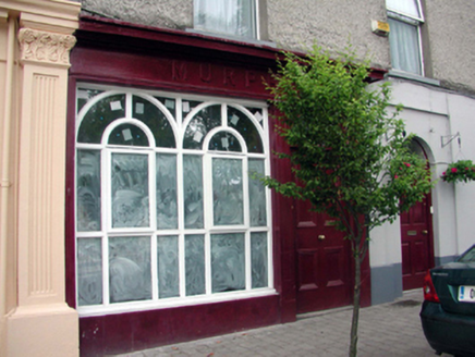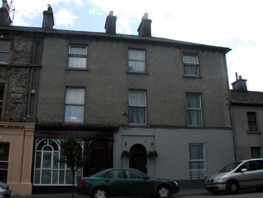 Terraced three-bay three-storey house, c.1860. Renovated, c.1885, with shopfront inserted to left ground floor. Refenestrated, pre-1999. Shopfront renovated, 2003. Now disused to left ground floor. One of a pair. Hipped (shared) slate roof with clay ridge tiles, rendered chimney stacks, and cast-iron rainwater goods on rendered eaves having corbels. Painted rendered, ruled and lined wall to ground floor with rendered course over, and unpainted roughcast walls to upper floors. Square-headed window openings with rendered sills (forming sill course to first floor), and replacement uPVC casement windows, pre-1999. Round-headed door opening in square-headed recessed panel with timber panelled door, and overlight. Timber shopfront, c.1885, to left ground floor with inscribed pilasters, replacement uPVC display windows, pre-1999, having round-headed panels with casement sections, timber panelled door with overlight, timber fascia over having raised lettering, and moulded cornice. Road fronted with concrete brick cobbled footpath to front.