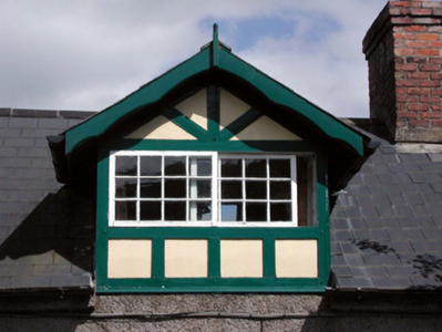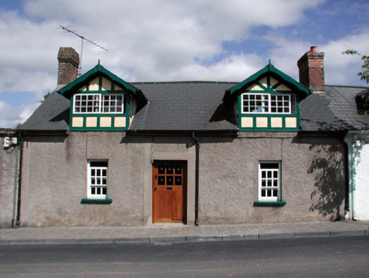 End-of-terrace three-bay single-storey estate worker’s house with dormer attic, c.1825. Extensively renovated, c.1900, with dormer attic added. Reroofed and renovated, pre-1999. One of a terrace of six. Pitched (shared) roof (gabled to dormer attic windows) with replacement artificial slate, pre-1999, clay ridge tiles, red brick Running bond chimney stacks, profiled timber bargeboards, and cast-iron rainwater goods on rendered eaves. Unpainted replacement roughcast walls, c.1900, with rendered strips to ends. Square-headed window openings to ground floor with stone sills, and replacement 6/6 timber sash windows, pre-1999. Square-headed window openings to dormer attic in timber surround having timber-frame detailing, and 12/12 horizontal sash windows. Square-headed door opening with rendered surround, c.1900, and replacement glazed tongue-and-groove timber panelled door, pre-1999. Road fronted with concrete brick cobbled footpath to front.