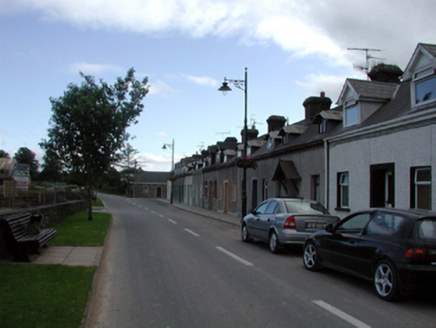 Terraced three-bay single-storey estate worker’s house with dormer attic, c.1885. Extensively renovated, c.1985. One of a terrace of eleven. Pitched (shared) roof (gabled to dormer attic windows) with replacement artificial slate, c.1985, clay ridge tiles, red brick Running bond (shared) chimney stacks, zinc-lined swept roofs to dormer attic windows having finials, and cast-iron rainwater goods on red brick eaves having consoles. Unpainted roughcast walls. Square-headed window openings (triangular-headed to dormer attic) with stone sills. Replacement timber casement windows, c.1985. Square-headed door opening under swept gabled timber canopy on consoles having decorative bargeboards, and replacement glazed timber panelled door, c.1985. Road fronted with concrete brick cobbled footpath to front.