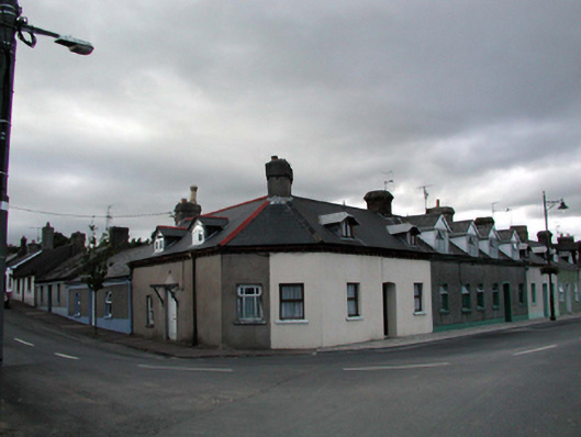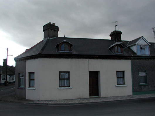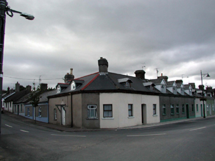 Terraced three-bay single-storey estate worker’s house with dormer attic, c.1885, on a corner site with single-bay single-storey canted side elevation to south. Extensively renovated, c.1985. One of a terrace of eleven. Pitched (shared) roof (gabled to dormer attic windows; hipped section to canted elevation) with replacement artificial slate, c.1985, clay ridge tiles, rendered and red brick Running bond (shared) chimney stacks, zinc-lined swept roofs to dormer attic windows having finials, and cast-iron rainwater goods on red brick eaves having consoles. Painted rendered walls. Square-headed window openings (triangular-headed to dormer attic) with stone sills. Replacement timber casement windows, c.1985. Square-headed door opening with replacement timber panelled door, c.1985. Road fronted on a corner site with concrete brick cobbled footpath to front.