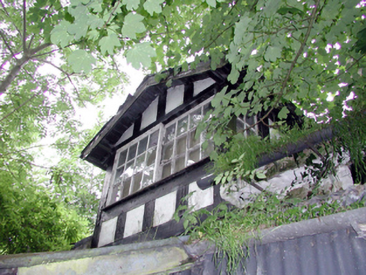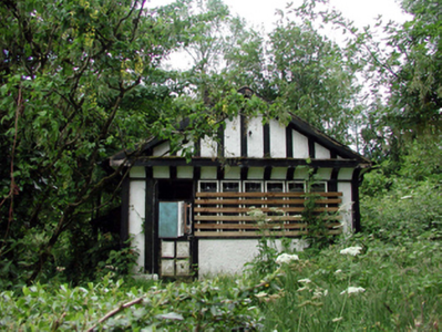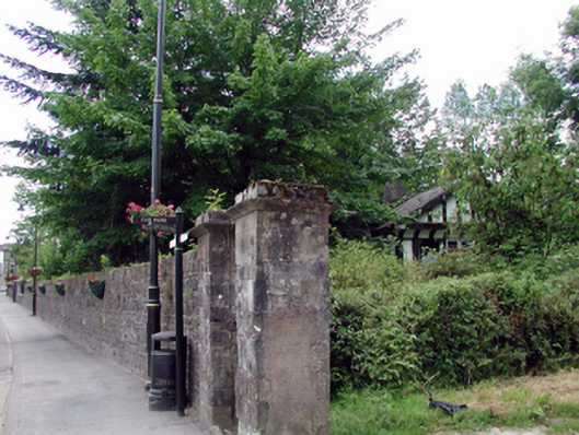 Detached single-bay single-storey gable-fronted Tudor-style gate lodge with dormer attic, c.1905, with three-bay single-storey side elevations. Now disused and part derelict. Pitched (gable-fronted) slate roof (gabled to dormer attic window) with clay ridge tiles, rendered chimney stack, timber bargeboards, and cast-iron rainwater goods on overhanging eaves. Painted rendered walls with painted timber detailing in form of Tudor-style timber framing. Painted timber surround to gable in form of pediment on coved cornice. Square-headed window openings with timber sills (on roughcast panel to front (north) elevation). Timber casement windows (in six-light arrangement to front (north) elevation) with leaded panels. 12/12 horizontal sash window to dormer attic. Square-headed door opening with glazed timber panelled door, and overlight. Set back from road in shared grounds with overgrown grounds to site.