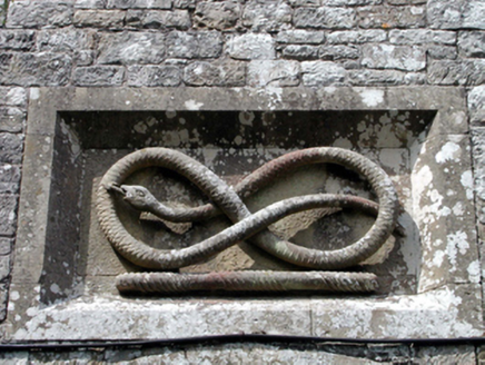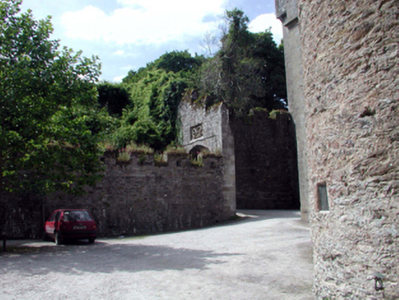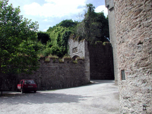 Gateway, c.1820, comprising four-centre-headed opening with chamfered reveals, irregular coursed piers, buttresses, and half-crow stepped parapet over having rectangular recessed panel with chamfered surround, and serpentine motif. Set back from road in grounds shared with Lismore Castle with sections of random rubble stone flanking boundary walls.