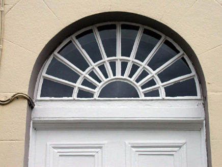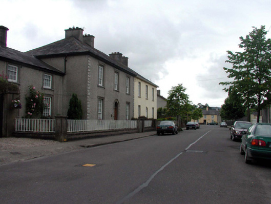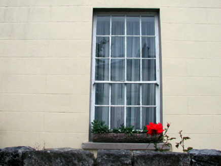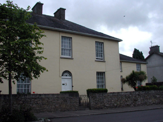 Semi-detached three-bay two-storey house, c.1825, retaining original aspect with two-bay two-storey recessed lower wing to south. One of a pair. Hipped (shared) slate roofs with clay ridge tiles, rendered chimney stacks and replacement uPVC rainwater goods, pre-1999, on rendered eaves. Painted rendered, ruled and lined walls. Square-headed window openings with rendered sills. 3/6, 4/8, 8/8 and 12/8 timber sash windows. Round-headed door opening with timber panelled door, and decorative fanlight. Set back from line of road with random rubble stone boundary wall to front having wrought iron gate.