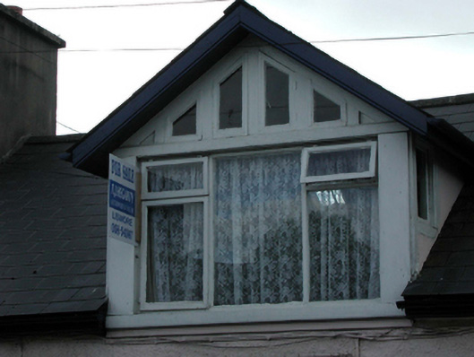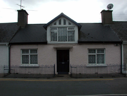Terraced three-bay single-storey house with dormer attic, c.1825. Renovated, c.1900, with dormer attic added. Refenestrated, c.1975. Reroofed, c.2000. Pitched (shared) roof (gabled to dormer attic window) with replacement artificial slate, c.2000, clay ridge tiles, rendered (shared) chimney stacks, timber bargeboards, and replacement uPVC rainwater goods, c.2000, on rendered eaves. Painted roughcast walls. Square-headed window openings with stone sills, and replacement timber casement windows, c.1975, having overlights to gable to dormer attic window. Square-headed door opening with rendered entablature on consoles, and replacement glazed timber panelled door, c.1975. Set back from line of road with sections of hoop iron railings to front.