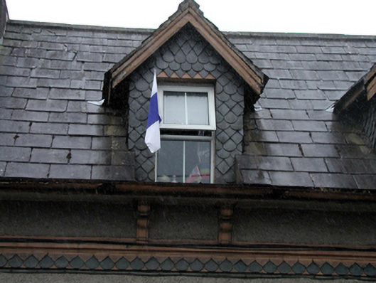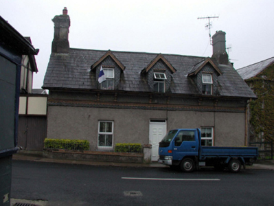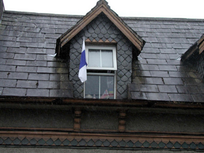 Detached three-bay single-storey house with half-dormer attic, c.1875. Refenestrated, c.2000. Pitched slate roof (gabled to half-dormer attic windows) with clay ridge tiles, rendered profiled chimney stacks, timber eaves, and cast-iron rainwater goods on overhanging eaves having consoles. Unpainted roughcast walls with decorative yellow and vitrified blue brick stringcourse in saw-tooth pattern having moulded course over. Slate hanging to dormer attic window with fish scale-pattern slate. Square-headed window openings with rendered sills, and replacement uPVC casement windows, c.2000. Square-headed door opening with replacement uPVC panelled door, c.2000, and overlight. Set back from line of road with sections of hoop iron railings to front on unpainted roughcast plinth having rendered piers.
