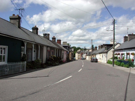 Terraced three-bay single-storey house, c.1910, with two-bay single-storey recessed entrance bay to right. Extensively renovated, pre-1999. One of a terrace of six. Pitched (shared) roof with replacement artificial slate, pre-1999, clay ridge tiles, rendered (shared) chimney stacks, and replacement uPVC rainwater goods, pre-1999, on timber eaves. Painted rendered walls. Square-headed window openings (one in recessed entrance bay) with stone sills, and replacement uPVC casement windows, pre-1999. Square-headed door opening in recessed entrance bay having timber posts with brackets, and replacement glazed uPVC door, pre-1999, with sidelight. Road fronted with sections of hoop iron railings to front.