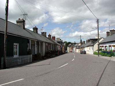 Terraced three-bay single-storey house, c.1910, retaining original fenestration with two-bay single-storey recessed entrance bay to left. Reroofed, pre-1999. One of a terrace of six. Pitched (shared) roof with replacement artificial slate, pre-1999, clay ridge tiles, rendered (shared) chimney stacks, and replacement uPVC rainwater goods, pre-1999, on timber eaves. Painted rendered walls. Square-headed window openings (one in recessed entrance bay) with stone sills, painted red brick block-and-start surrounds, and timber casement windows. Square-headed door opening in recessed entrance bay having timber posts with brackets, and glazed timber panelled door. Road fronted with planted verge to front.