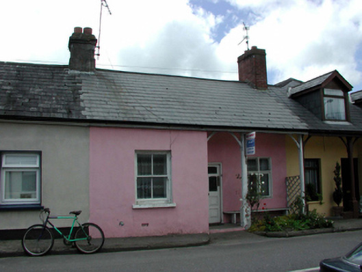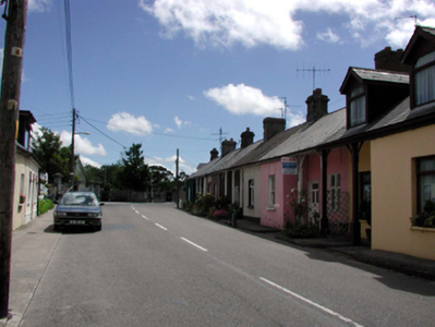 Terraced three-bay single-storey house, c.1910, retaining early fenestration with two-bay single-storey recessed entrance bay to right. Reroofed, pre-1999. One of a terrace of six. Pitched (shared) roof with replacement artificial slate, pre-1999, clay ridge tiles, rendered and red brick Running bond (shared) chimney stacks, and iron rainwater goods on timber eaves. Painted rendered walls. Square-headed window openings (one in recessed entrance bay) with stone sills (no sill to recessed entrance bay). 2/2 timber sash window with timber casement window to recessed entrance bay. Square-headed door opening in recessed entrance bay having timber posts with brackets, and glazed timber panelled door. Road fronted with planted verge and concrete footpath to front.