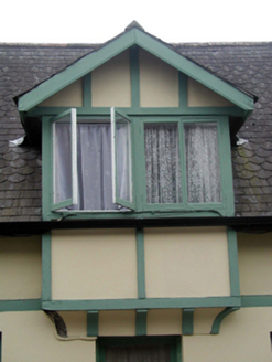 End-of-terrace three-bay single-storey house with half-dormer attic, c.1835. Extensively renovated, c.1910, with single-bay single-storey gabled jettied box oriel window added to dormer attic. Renovated, c.1985, with window opening remodelled to left ground floor. Pitched slate roof (gabled to oriel window) with courses of slate in fish scale pattern, clay ridge tiles, red brick Running bond chimney stack, decorative timber bargeboards, and cast-iron rainwater goods on overhanging timber eaves. Painted rendered wall to front (north-east) elevation with painted rendered dressings, c.1910, in form of Tudor-style timber framing. Painted roughcast walls to remainder. Square-headed window openings (including to box oriel window on panelled apron having consoles to jetty; remodelled, c.1985, to left ground floor) with rendered sills. 1/1 timber sash window to right ground floor with timber casement windows to oriel window. Replacement timber casement window, c.1985, to remodelled opening. Square-headed door opening with replacement glazed timber panelled door, c.1910. Road fronted with concrete footpath to front.