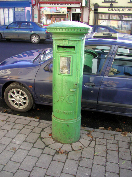 This cast-iron post box, which is still in use, is an attractive item of street furniture and represents an early surviving artifact of mass-produced cast ironwork. The raised detailing is of artistic interest, the Gaelic script representing the continued promotion of a national identity within the emergent independent state.