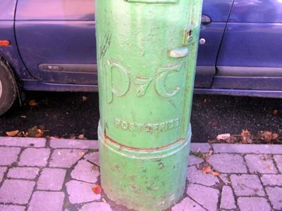 Freestanding cast-iron pillar post box, c.1930, with raised 'P&T' monogram in Gaelic script, and shallow domed capping. Road-fronted on concrete brick cobbled footpath.