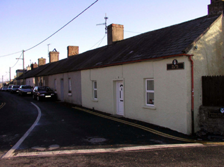 End-of-terrace three-bay single-storey estate worker’s house, c.1775, on a corner site. Refenestrated, c.2000. One of a terrace of four. Pitched (shared) slate roof with clay ridge tiles, rendered and red brick Running bond chimney stacks, and cast-iron rainwater goods. Painted roughcast walls. Square-headed window openings with stone sills, and replacement uPVC casement windows, c.2000. Square-headed door opening with rendered surround having keystone motif, and replacement glazed uPVC panelled door, c.2000. Road fronted on a corner site.