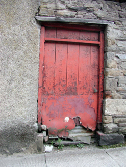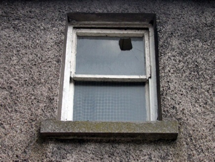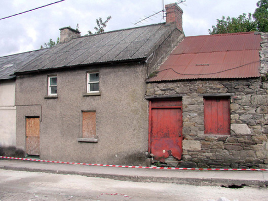 End-of-terrace two-bay two-storey house, c.1850, retaining early fenestration. Reroofed, c.1950. Now disused. Pitched roof with replacement corrugated-asbestos, c.1950, clay ridge tiles, rendered and red brick Running bond chimney stacks, rendered coping, and cast-iron rainwater goods. Unpainted roughcast walls. Square-headed window openings with rendered sills, and 1/1 timber sash windows (one window opening now boarded-up). Square-headed door opening now boarded-up. Road fronted with concrete footpath to front. (ii) Attached two-bay single-storey rubble stone outbuilding, c.1925, to east. Now disused. Pitched painted corrugated-iron roof with iron ridge tiles, and rubble stone coping. Random rubble stone walls. Square-headed window opening with no sill, timber lintel, and timber boarded fitting. Square-headed door opening with timber lintel, and timber boarded door.