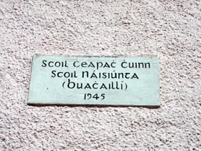 Detached six-bay double-height national school, dated 1945, retaining original fenestration with two-bay single-storey flat-roofed recessed lower entrance bay to right (east). Extended, c.1970, comprising single-bay single-storey flat-roofed end bay to right (west), and three-bay single-storey flat-roofed wing to right (east). Pitched artificial slate roof with clay ridge tiles, roughcast chimney stack, and cast-iron rainwater goods on rendered eaves. Flat concrete roofs to additional ranges. Painted roughcast walls to original block with cut-stone date stone/plaque. Painted red brick Running bond walls to additional ranges. Square-headed window openings to original block with concrete sills, and 6/6 timber sash windows. Square-headed door opening with timber door. Square-headed window openings to additional ranges with concrete sills, and timber casement windows. Set back from road with landscaped grounds to site.