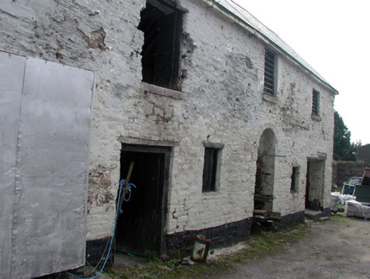 Detached five-bay two-storey rubble stone outbuilding, c.1725, originally forming part of larger military barracks complex with square-headed carriageway to right ground floor. Reroofed, c.2000. Pitched roof with replacement artificial slate, c.2000, clay ridge tiles, and no rainwater goods on rendered squared rubble stone eaves. Limewashed lime rendered walls over random rubble stone construction. Square-headed window openings (some slit-style to rear (east) elevation) with no sills, and timber lintels. Timber boarded fittings with some having louvered timber panel fittings. Square-headed door opening to left ground floor with timber lintel, and timber boarded door. Round-headed door opening to centre ground floor with rubble stone voussoirs. Square-headed carriageway to right ground floor with timber lintel. Fittings not visible. Set perpendicular to road with side (north) elevation fronting on to road.