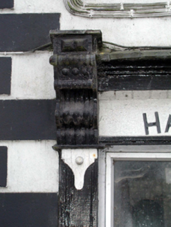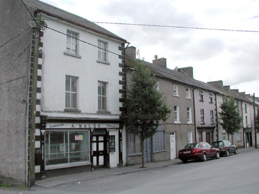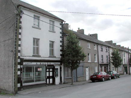 End-of-terrace two-bay three-storey house, c.1850, on a corner site with single-bay three-storey side elevation, and single-bay two-storey return to south-west. Renovated, c.1900, with shopfront inserted to ground floor. Refenestrated, c.2000. Now disused to ground floor. Pitched slate roofs with clay ridge tiles, rendered chimney stacks, and cast-iron rainwater goods on rendered eaves having iron brackets. Painted rendered wall to front (north-east) elevation with rendered quoins to ends. Unpainted roughcast walls to remainder. Square-headed window openings with stone sills. Replacement uPVC casement windows, c.2000. Timber shopfront, c.1900, to ground floor with decorative pilasters, fixed-pane timber display window having iron bar, timber panelled double doors with overlight, replacement glazed uPVC panelled door, c.2000, and timber fascia over having decorative consoles, and moulded cornice. Road fronted on a corner site with concrete flagged footpath to front.