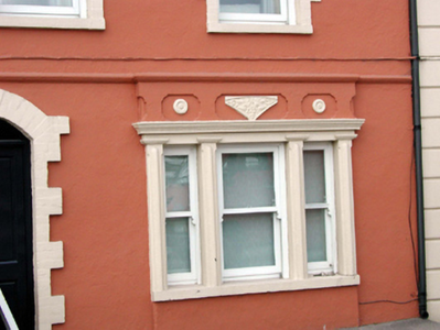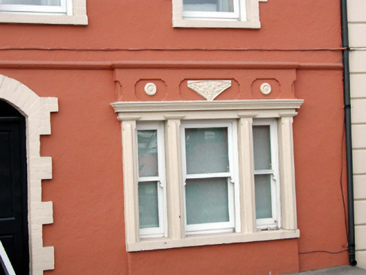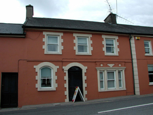 Terraced three-bay two-storey house, c.1870. Refenestrated, c.1995. Pitched (shared) slate roof with clay ridge tiles, rendered chimney stacks, rendered coping, and cast-iron rainwater goods on rendered eaves. Painted rendered walls with rendered stringcourse to first floor. Square-headed window openings (in tripartite arrangement to right ground floor; segmental-headed window opening to left ground floor) with rendered sills, painted red brick block-and-start surrounds, and rendered panelled pilaster surround to tripartite opening having moulded cornice, and decorative panel over. Replacement 1/1 timber sash windows, c.1995. Segmental-headed door opening with painted red brick block-and-start surround, replacement timber panelled door, c.1995, and overlight. Road fronted with concrete footpath to front.