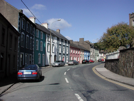 Terraced three-bay three-storey house, c.1850. Extensively renovated, c.2000. One of a group of four. Pitched (shared) roof with replacement artificial slate, c.2000, clay ridge tiles, rendered (shared) chimney stacks, and replacement uPVC rainwater goods, c.2000, on rendered eaves. Painted rendered walls. Square-headed window openings with rendered sills, and rendered surrounds, c.2000. Replacement uPVC casement windows, c.2000. Square-headed door opening with rendered surround, c.2000, and replacement timber panelled door, c.2000, having overlight. Road fronted with concrete footpath to front.